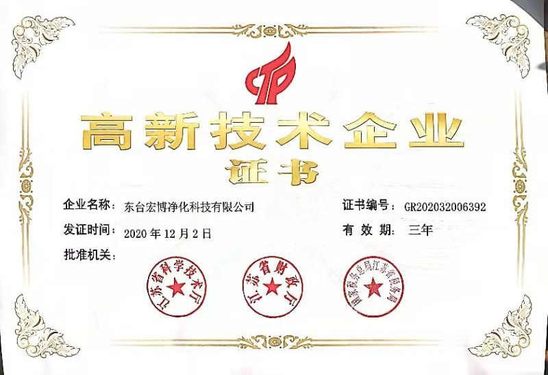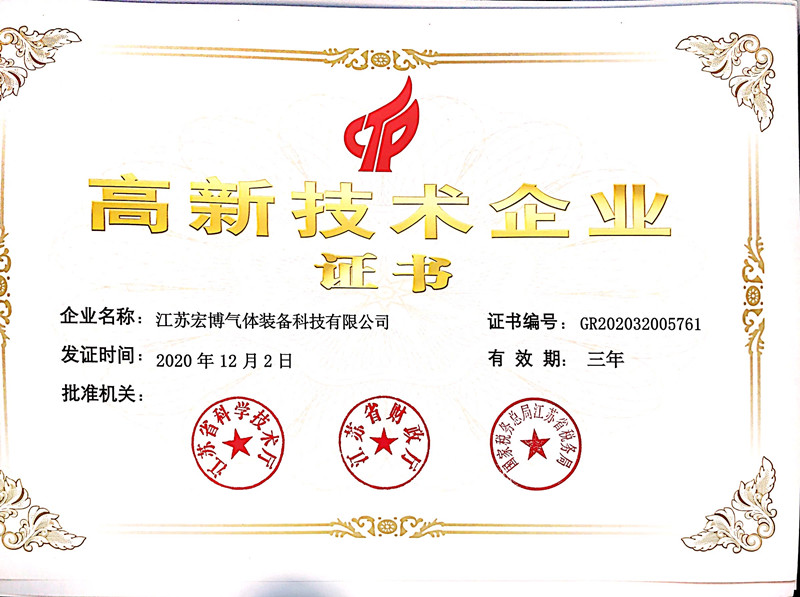 2020年,宏博企業(yè)江蘇宏博氣體裝備科技有限公司,生產(chǎn)基地-東臺(tái)宏博凈化科技有限公司同時(shí)獲評(píng)高新技術(shù)企業(yè),并于近日收到由江蘇省科學(xué)技術(shù)廳、江蘇省財(cái)政廳、國(guó)家稅務(wù)總局江蘇省稅務(wù)局聯(lián)合頒發(fā)的《高新技術(shù)企業(yè)證書》。
